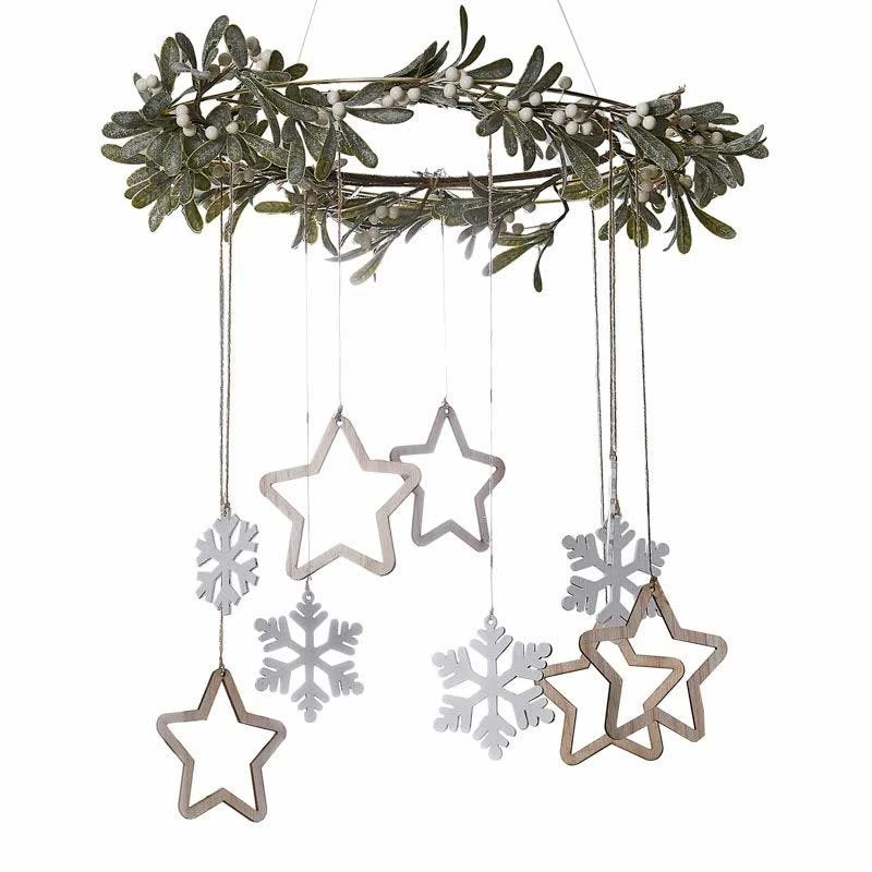 Deck the halls (and your ceilings!) with this alternative hanging Christmas decoration. This Christmas chandelier is perfect to take your decorations to the next level. Let your guests have a little kiss under the mistletoe with this delicate artificial mistletoe foliage with hanging wooden stars and snowflakes. Each pack contains: