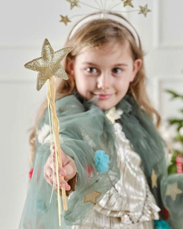 Accessorise their looks with this beautiful gold star wand, the perfect addition to the costume box for Christmas, parties and fun imaginative play. This lovely fairy wand is made from gold satin and is topped with a gold glitter star.