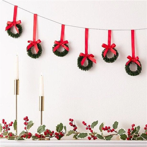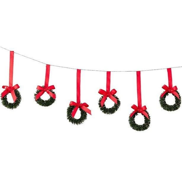 - Each pack contains one Christmas wreath bunting consisting of eight small artificial wreaths strung on 2m of metallic red string.