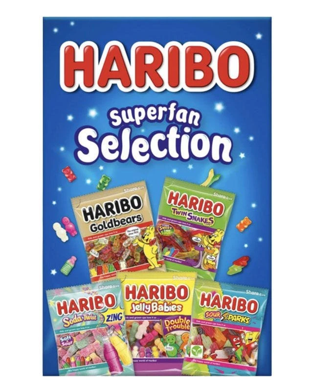 INGREDIENTS:Â Goldbears / Soda Twist Zing / Jelly Babies Double Trouble / Twin Snakes / Fizzy and Fruit Flavour Gums: Glucose Syrup, Sugar, Gelatine, Dextrose, Fruit Juice from Concentrate: Apple, Strawberry, Raspberry, Orange, Lemon, Pineapple; Acids: Citric Acid, Tartaric Acid, Malic Acid; Acidity Regulators: Calcium Citrates, Sodium Hydrogen Malate; Fruit and Plant Concentrates: Apple, Aronia, Bilberry, Blackberry, Carrot, Elderberry, Grape, Kiwi, Lemon, Mangi, Orange, Passionfruit, Radish, Safflower, Spirulina, Sweet Potato; Caramelised Sugar Syrup, Sunflower Oil, Flavouring, Glazing Agent: Beeswax; Elderberry Extract.Sour Sparks / Sour Fruit and Colar Gums: Glucose Syrup, Sugar, Starch, Acids: Citric Acid, Tartaric Acid, Malic Acid; Fruit and Plant Concentrates: Aronia, Blackcurrant, Elderberry, Grape, Lemon, Orange, Safflower, Spirulina; Caramelised Sugar Syrup, Sunflower Oil, Flavouring, Glazing Agent: Beeswax; Elderberry Extract. .