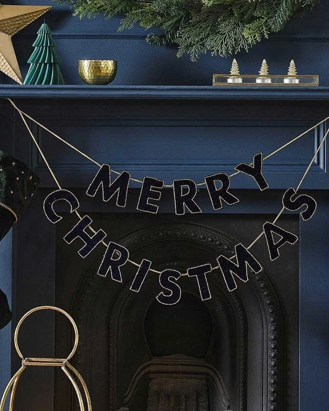 - Add our beaded fabric Christmas bunting to the fireplace for an opulent feel