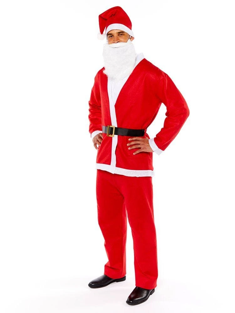 Play the big man himself with this easy-wearing traditional Santa suit! This is the full kit, including trousers and jacket, belt, hat, and the all-important beard and moustache.