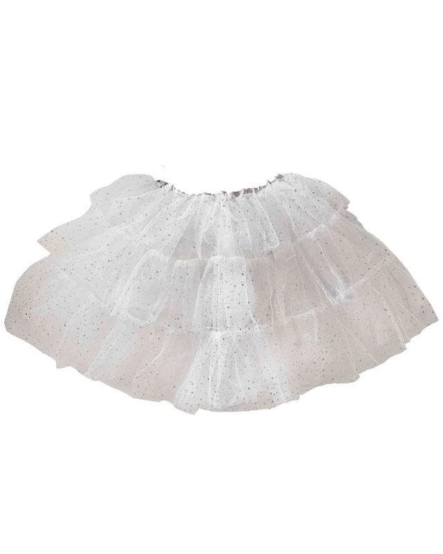 This beautiful tutu is made from white tulle with silver flecks and features a silver satin waistband. 100% polyester.