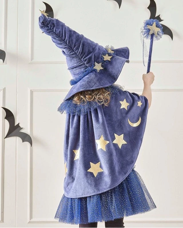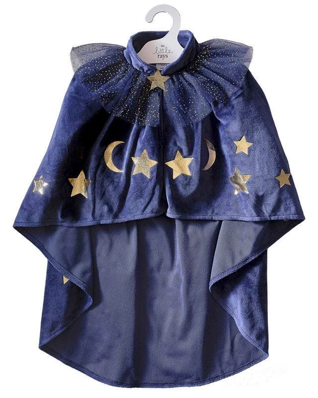 This wizard cape is made from sumptious navy velvet, adorned with gold stars and moons and features a navy tulle collar with gold flecked detailling.