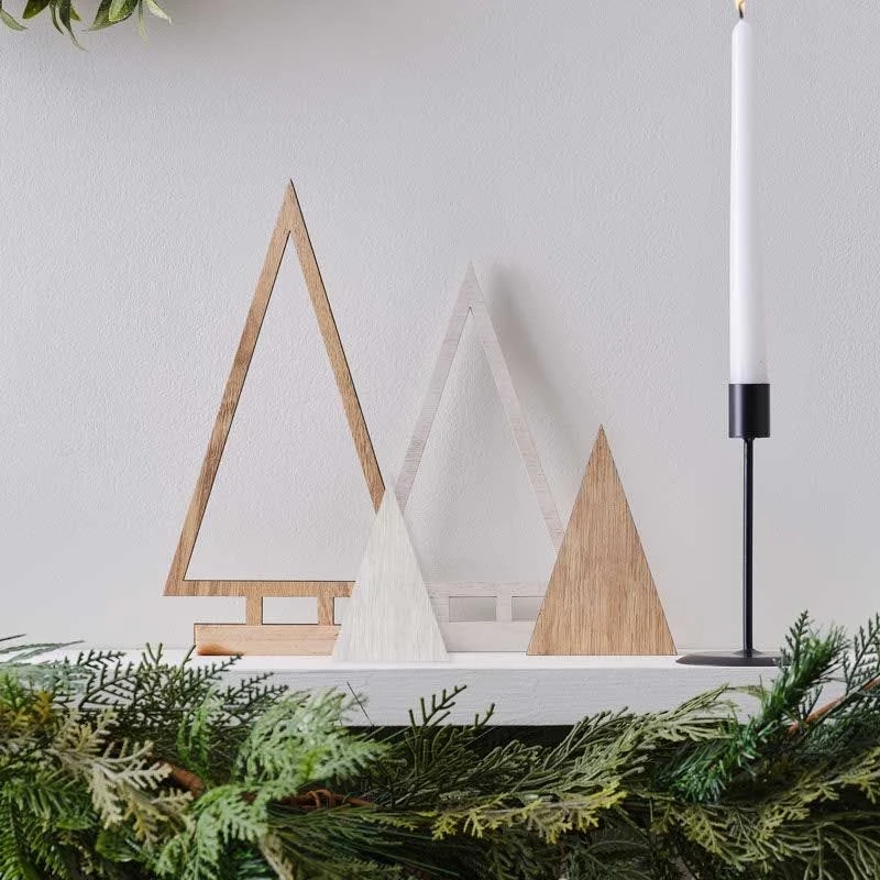 These traditional Christmas wooden decorations will look beautiful displayed around your home. This Christmas fireplace decoration contains 4 x Christmas ornaments. 1 tree decoration measures 30cm (H) x 16cm (W), 1 tree decoration measures 25cm (H) x 14cm (W) and 2 tree decorations measure 14cm (H) x 12cm (W).